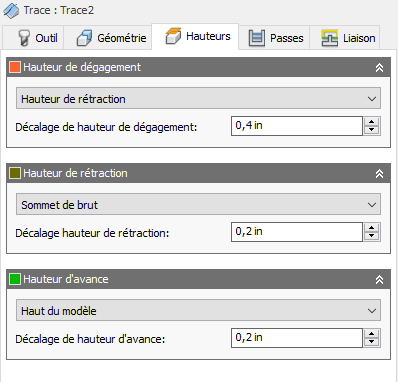 La hauteur de rétraction spécifie la hauteur qu'atteint l'outil avant la passe de coupe suivante. Elle doit être définie sur une valeur supérieure à celle des paramètres Hauteur d'avance et Haut. La hauteur de rétraction s'utilise conjointement avec le décalage ultérieur pour définir la hauteur.