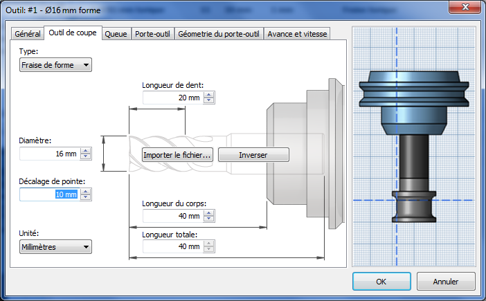 Boîte de dialogue Fraise de forme avec aperçu. Les lignes en pointillés indiquent le point de compensation de la trajectoire d'outil, qui est contrôlé par le diamètre et le décalage de pointe.