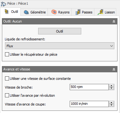 Sélectionnez le type de liquide de refroidissement à utiliser avec l'outil. Les options de sortie varient en fonction des fonctionnalités de la machine et de la configuration de son post-processeur.