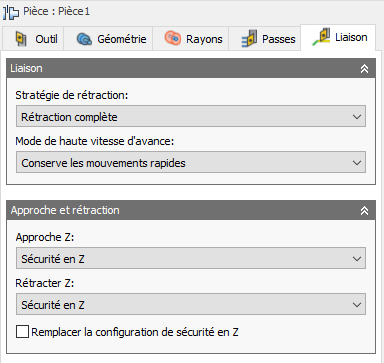 Rétracter Z : Définit la manière dont l'outil se positionne à la fin de la trajectoire d'outil.