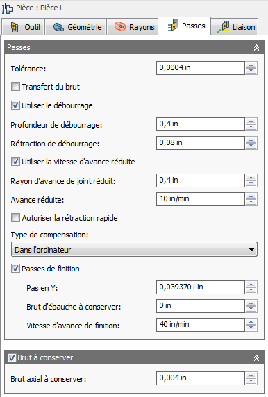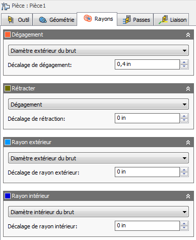 L'onglet Rayons permet de définir une zone de limitation radiale pour l'usinage. Ces paramètres sont codés en couleur afin de faciliter leur identification.
