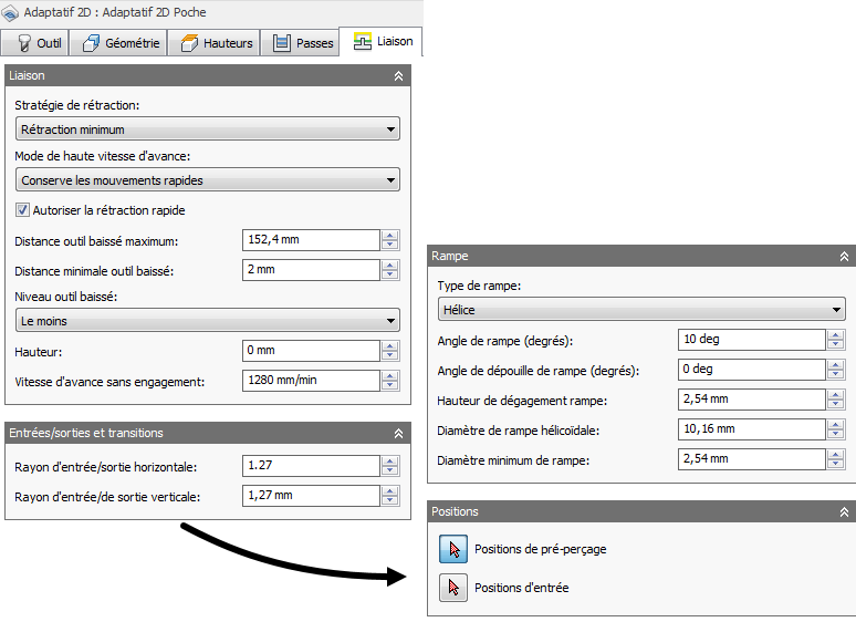 Le rayon de lissage de l'arc vertical s'étend entre le mouvement d'entrée et le mouvement de sortie le long de la trajectoire d'outil.