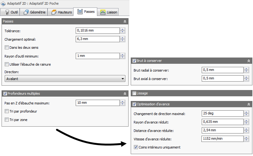 Dans le cadre des opérations de finition, la valeur par défaut est égale à 0 mm/0 po ; autrement dit, aucune quantité de matière n'est conservée.