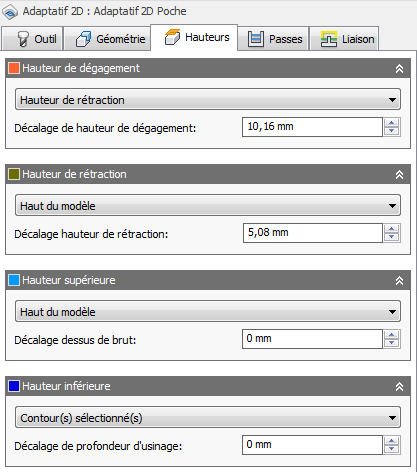 La hauteur de rétraction spécifie la hauteur qu'atteint l'outil avant la passe de coupe suivante. Elle doit être définie sur une valeur supérieure à celle des paramètres Hauteur d'avance et Haut. La hauteur de rétraction s'utilise conjointement avec le décalage ultérieur pour définir la hauteur.