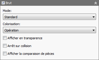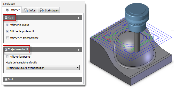 Outre la simulation ordinaire, vous pouvez cocher la case Brut pour afficher le brut dans la simulation normale. Il est également possible d'afficher l'outil, la trajectoire d'outil et le brut séparément ou conjointement. Pour cela, activez ou désactivez les cases à cocher Outil, Trajectoire d'outil et Brut.
