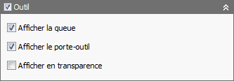 Le groupe Outil vous permet d'activer ou de désactiver la visibilité de l'arbre et du porte-outil de l'outil pendant la simulation. Vous pouvez également choisir de les afficher en transparence, ce qui vous permet de voir à travers.