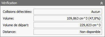 Le groupe Vérification affiche le nombre de collisions entre l'arbre et/ou le porte-outil et la pièce de travail, le cas échéant. Il indique également le volume de départ qui est le volume total du brut d'origine. Le brut éliminé lors de la simulation est signalé par la valeur Volume.