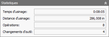 Le groupe Statistiques contient des informations sur l'ensemble de la trajectoire d'outil simulée. Les informations actuelles sont le temps total d'usinage, la distance totale d'usinage, le nombre d'opérations effectuées et le nombre de changements d'outil. Veuillez noter que le temps d'usinage est une estimation grossière éventuellement éloignée du temps d'usinage réel après post-traitement.