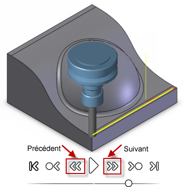 Dans Simulation, il est possible de naviguer simplement dans une trajectoire d'outil. Pour cela, cliquez sur les boutons Suivant et Précédent lorsque la simulation est interrompue. Chaque clic vous conduit au point précédent ou suivant de la trajectoire d'outil.