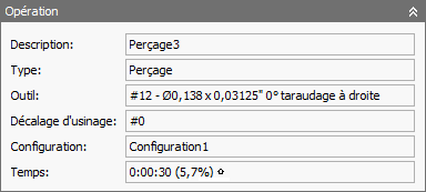 Les informations propres à une opération pour la stratégie contenant la position actuelle de l'outil ou la position mise en surbrillance sont indiquées dans le groupe Opération. La description de l'opération numérotée donnée dans la boîte de dialogue Opération pour la stratégie et l'outil actif sont indiqués.