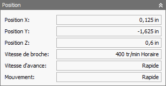 Le groupe Position contient des informations sur la position actuelle de l'outil. Ces informations incluent la position actuelle, la vitesse de la broche, l'avance et le mouvement. En mode hors animation, les informations s'appliquent à la position actuellement mise en surbrillance si elle est active et, dans le cas contraire, à la position actuelle de l'outil, tandis que, en mode animation, la position actuelle de l'outil est toujours affichée.
