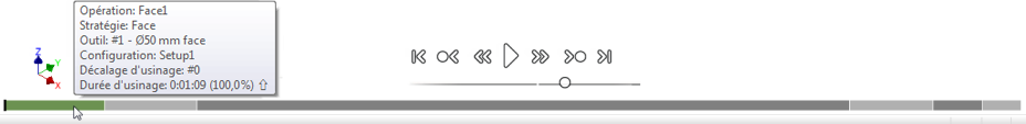 Simulation : vous pouvez contrôler la position actuelle de l'outil sur le curseur de positionnement situé dans le lecteur de simulation, dans la partie inférieure de la vue de simulation.