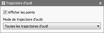 Le groupe Trajectoire d'outil contient différentes options permettant de contrôler la visualisation de la trajectoire d'outil. Les options disponibles permettent d'afficher, au cours de l'animation, l'ensemble de la trajectoire d'outil, toute trajectoire d'outil avant ou après la position actuelle de l'outil, la trajectoire d'outil pour l'opération ou le chemin de la trajectoire d'outil jusqu'à la position actuelle de l'outil.