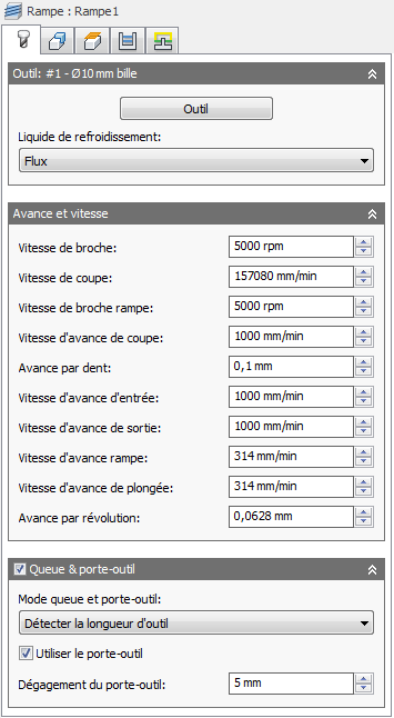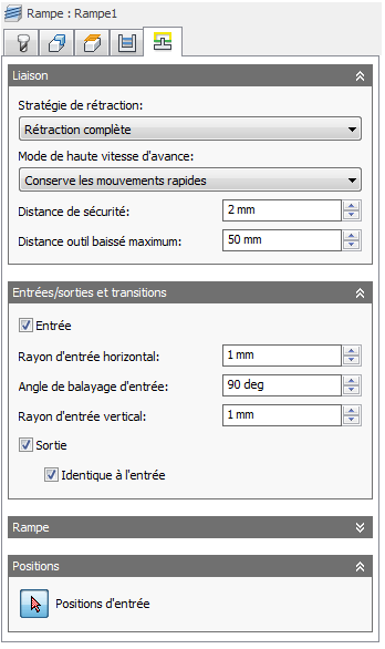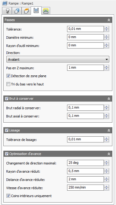 Indique l'incrément Z de rampe maximal par tour sur le profil de rampe. Ce paramètre permet de limiter la charge de l'outil lors des ouvertures pleine largeur pendant l'utilisation de la rampe.