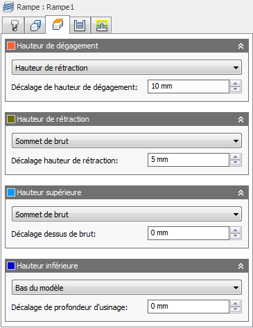 La hauteur de rétraction spécifie la hauteur qu'atteint l'outil avant la passe de coupe suivante. Elle doit être définie sur une valeur supérieure à celle des paramètres Hauteur d'avance et Haut. La hauteur de rétraction s'utilise conjointement avec le décalage ultérieur pour définir la hauteur.