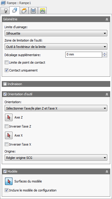 La stratégie Finition de rampe est conçue pour les zones pentues, à l'instar de la stratégie Contour. Toutefois, la stratégie Rampe, comme son nom l'indique, rampe jusqu'au bas des parois plutôt que d'usiner avec un Z constant, comme c'est le cas de la stratégie Contour. Cette approche permet de s'assurer que l'outil est constamment engagé, ce qui peut être important pour certaines matières telles que la céramique.