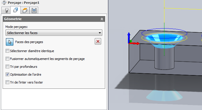 Inventor CAM fournit une méthode de perçage unique pour les faces coniques telles que des alésages à la fraise. Lorsque vous sélectionnez une face conique, la profondeur de perçage est automatiquement ajustée de façon à ce que le bout de l'outil entre en contact avec l'extrémité de la face conique.
