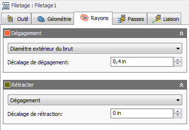 L'onglet Rayons permet de définir une zone de limitation radiale pour l'usinage. Ces paramètres sont codés en couleur afin de faciliter leur identification.