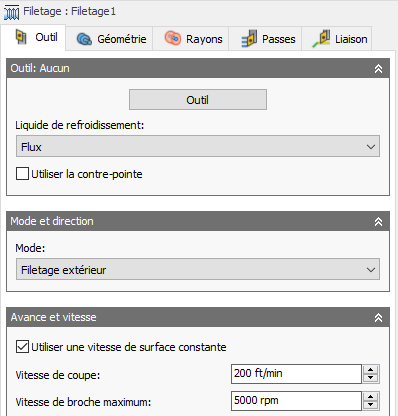 Il s'agit de la vitesse de coupe exprimée en tant que vitesse de l'outil sur la surface de la pièce. Elle est exprimée en pi/min ou m/min selon la façon dont le paramètre Unités est défini.