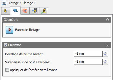 Indique la distance à usiner au-delà de l'arrière du modèle. Si une valeur positive est indiquée, la position est allongée à la fin de l'opération de coupe. Si une valeur négative est indiquée, la distance de filetage totale est raccourcie à la fin de l'opération de coupe.