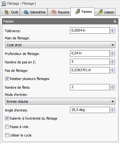 Spécifie le pas de filetage. La valeur Pas correspond à la distance de 1 filetage. Lorsque les filetages sont indiqués en pouces, la formule est la suivante : 1 ÷ nombre de filetages par pouce. Pour un filetage de type 1/2-13, le pas correspond à 1÷13 = 0,0769. Pour les filetages indiqués en unités métriques, le pas correspond à celui indiqué. Pour un filetage de type M16 x 2, le pas est de 2 mm.