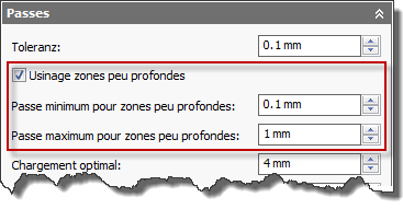 Lorsque cette option est activée, l'usinage des zones peu profondes est contrôlé par deux paramètres :