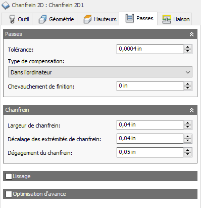 L'option Chanfrein 2D permet de créer une arête biseautée sur la pièce. Elle est sélectionnable à partir des arêtes ou des esquisses. Un outil conique est requis.