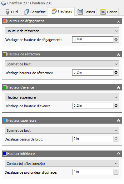 Le paramètre Décalage de profondeur d'usinage est appliqué. Il est défini par rapport à la hauteur inférieure sélectionnée dans la liste déroulante ci-dessus.