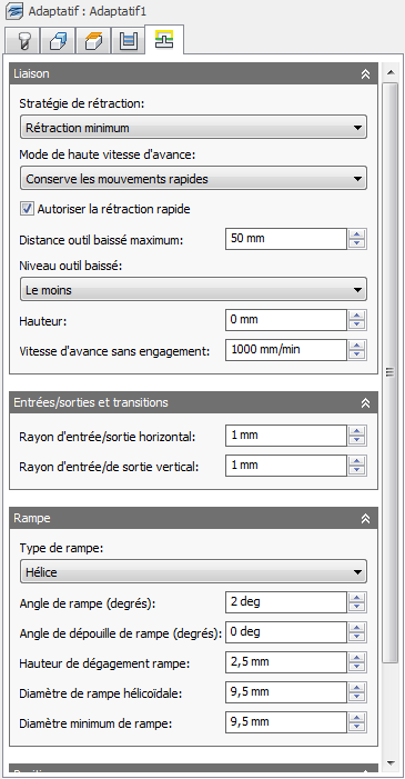 Cette valeur doit toujours être inférieure au diamètre de la rampe hélicoïdale, de sorte que le système puisse calculer un intervalle adapté à la poche ou au canal disponible. Des diamètres plus petits peuvent réduire l'évacuation des copeaux, provoquer des mouvements saccadés de la machine, voire casser l'outil.