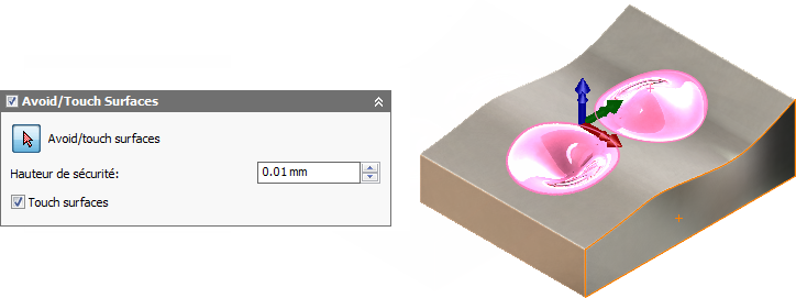 Vous pouvez inverser la signification de l'option Surfaces à éviter en cochant la case Surfaces à toucher. Lorsque cette option est activée, les surfaces d'évitement désignent les surfaces à toucher dans les limites de la hauteur de sécurité tandis que les surfaces restantes sont à éviter.