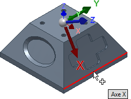 - Il est alors nécessaire d'indiquer la direction de l'axe X. Assurez-vous que le bouton Axe X de l'orientation de l'outil est actif et sélectionnez l'arête horizontale de la pièce, comme illustré ci-dessous :