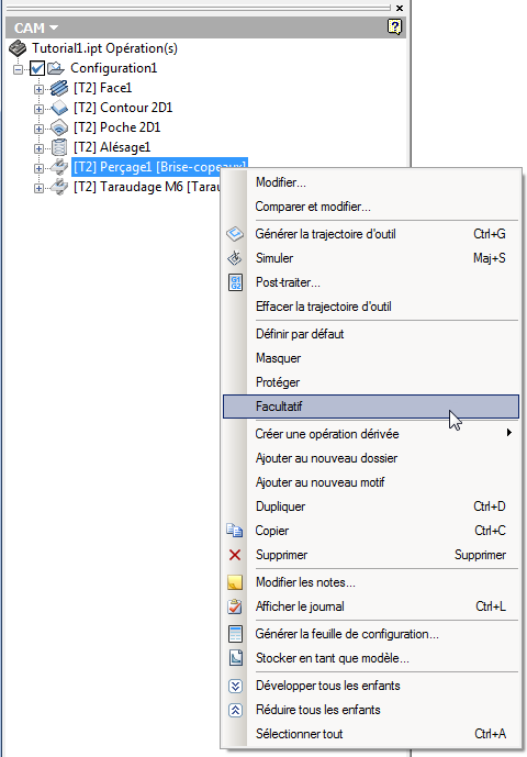 Pour rendre une opération facultative, cliquez avec le bouton droit de la souris sur l'opération dans le navigateur FAO et sélectionnez Optionnel dans le menu contextuel. Vous pouvez de nouveau rendre l'opération obligatoire en sélectionnant Optionnel encore une fois.