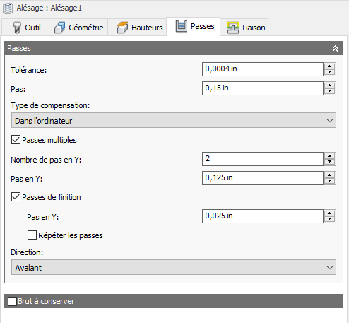 Dans le cadre des opérations de finition, la valeur par défaut est égale à 0 mm/0 po ; autrement dit, aucune quantité de matière n'est conservée.
