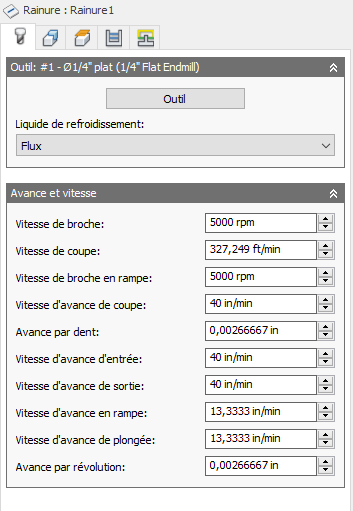 Paramètres de coupe pour les broches et l'avance.