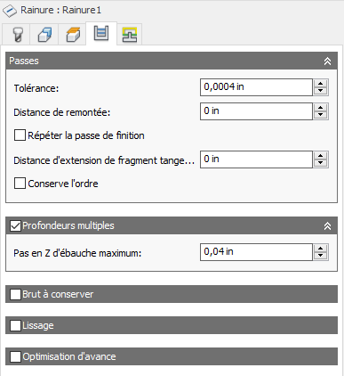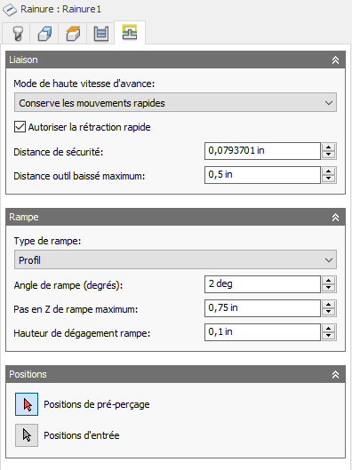 Par défaut, l'action associée à la rainure consiste à avancer en rampe jusqu'à la profondeur. L'outil avancera en zigzag jusqu'à la profondeur complète. L'une des manières permettant de réduire la charge de l'outil consiste à effectuer plusieurs coupes en profondeur.