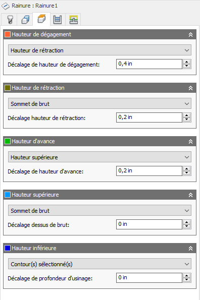 La hauteur de rétraction spécifie la hauteur qu'atteint l'outil avant la passe de coupe suivante. Elle doit être définie sur une valeur supérieure à celle des paramètres Hauteur d'avance et Haut. La hauteur de rétraction s'utilise conjointement avec le décalage ultérieur pour définir la hauteur.