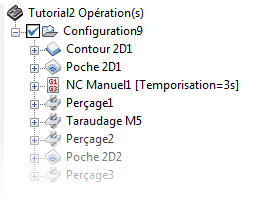 Inventor CAM vous permet d'insérer des entrées NC manuelles spéciales dans le navigateur FAO. Ces entrées peuvent être utilisées pour contrôler directement le code NC généré dans le programme NC. Par exemple : forcer un changement d'outil qui ne serait pas nécessaire autrement. La configuration du post-processeur est entièrement responsable de l'utilisation appropriée de ces commandes.