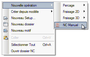 Accès à NC Manuel à partir du menu contextuel Nouvelle opération