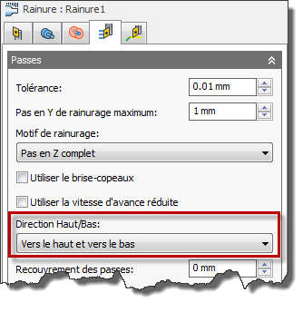 Dans la stratégie Rainurage de tournage, le paramètre Direction Haut/Bas permet de contrôler la direction des passes de finition. Les options disponibles sont : Vers le haut et vers le bas, Bas uniquementou Haut uniquement.