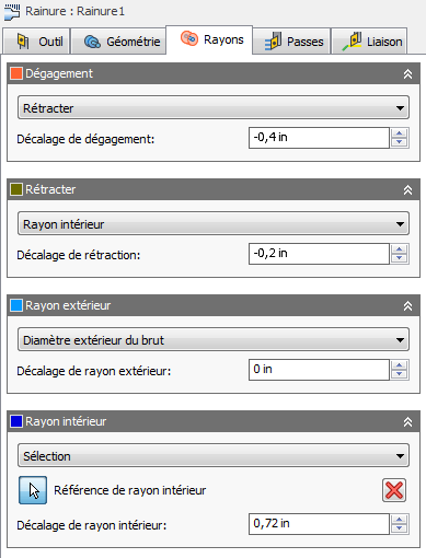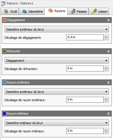 L'onglet Rayons permet de définir une zone de limitation radiale pour l'usinage. La boîte de dialogue change selon que le paramètre Mode de tournage (onglet Outil) est défini sur Rainurage extérieur ou Rainurage intérieur. Ces paramètres sont codés en couleur afin de faciliter leur identification.