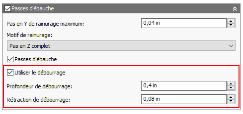 Rétraction de débourrage : indique la distance de rétraction entre les débourrages le long de la direction de coupe.