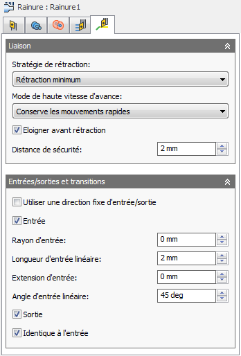 Activez ce paramètre pour générer un mouvement d'entrée (flèche rouge) vers le profil de coupe.