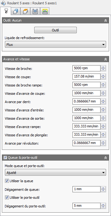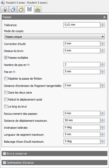 Dans le cadre des opérations de finition, la valeur par défaut est égale à 0 mm/0 po ; autrement dit, aucune quantité de matière n'est conservée.