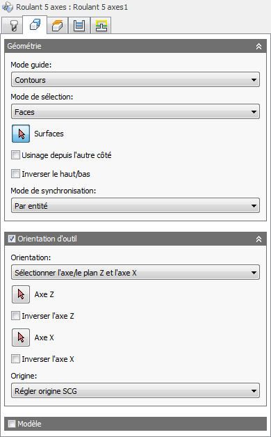 Ce mode prend en charge l'usinage à partir de contours uniquement ou à partir de surfaces. Choisissez Contours ou Surfaces dans le menu déroulant.