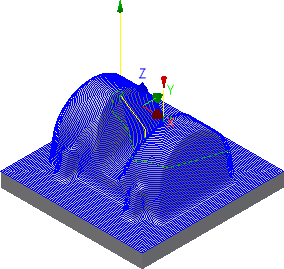 Il reste désormais 0,1 mm de matière sur la plus grande partie de la pièce. Il en reste un peu plus sur le dessus des surfaces de base, à l'intérieur des congés de 4 mm et sur la partie inférieure des congés au niveau des surfaces de base. Une stratégie Crête constante est utilisée pour finir la pièce.