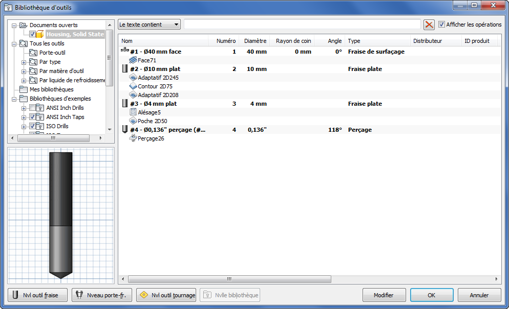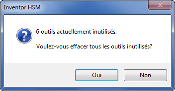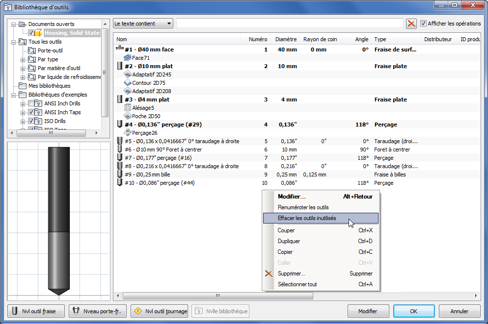 Lors de la réalisation d'une tâche, il est fréquent de définir plusieurs outils et de les tester afin d'obtenir le résultat souhaité pour l'opération sélectionnée. Après avoir terminé toutes les opérations d'usinage d'une pièce, vous pouvez trouver de nombreux outils, dans la bibliothèque d'outils du document actif, qui ne sont pas affectés à une opération (des outils inutilisés).