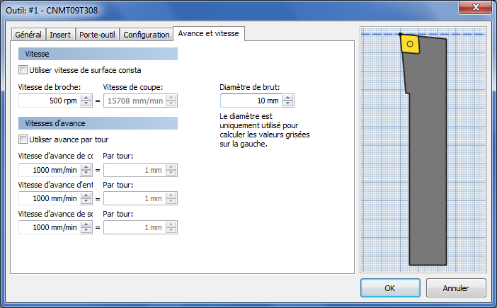 Vitesse de la broche exprimée en tant que vitesse de l'outil sur la surface.