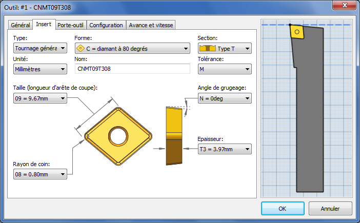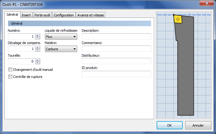 La boîte de dialogue Nouvel outil de tournage vous permet de modifier un outil de tournage et se compose de cinq onglets :