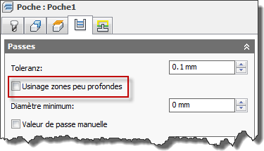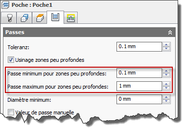 Si vous cochez la case Usinage zones peu profondes, les deux paramètres de contrôle suivants apparaissent :