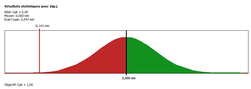 Les nombres qui apparaissent au-dessus du graphique indiquent les limites supérieures ou inférieures et représentent la chaîne de cotes au niveau de la cible de qualité spécifiée. La zone du graphique contenue dans les limites de spécification est affichée en vert et la zone située en-dehors en rouge.